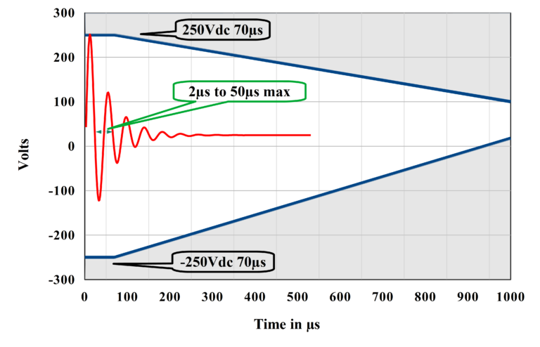 Let’s take as example the injected voltage spikes described into the MIL-STD-1275F. The table 3 in part 1 of this story shows a spike with the following specifications: +/-250 V 70 μs and 200 mJ. This is referring to the envelope of the transient spike described into the standard (Figure 1 below). Over the course of the last three revisions of Mil-STD-1275, the maximum energy specified increased from 15 mJ in revisions C and D to 2000 mJ in revision E, and finally returned to 200 mJ in revision F.